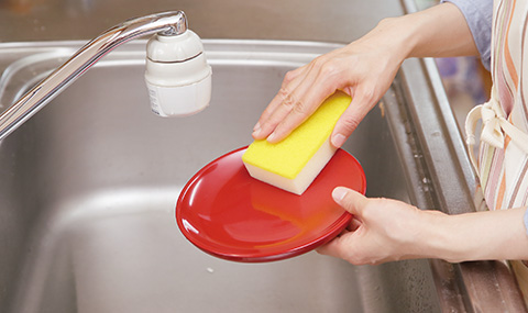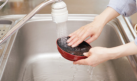 軽い汚れは、さっとぬるま湯で洗えば充分。一番厄介なお弁当や飯椀などの御飯物のこびりつきは、内側にお湯をはって、10分程度置いておきましょう。